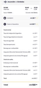 • US$40,80 de tasa de embarque internacional, aplicada por Paraguay en el tramo de regreso.