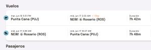 El vuelo de regreso partirá desde Rosario el miércoles 17 de junio a las 03:39, arribando a Punta Cana a las 10:27, con una duración aproximada de 7 horas y 48 minutos.