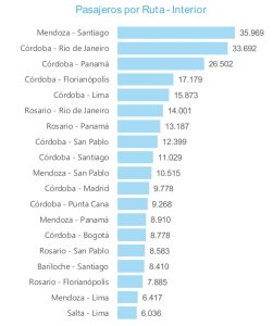 Córdoba (COR): Se mantiene como el líder indiscutido fuera de Buenos Aires. En enero movilizó 197.000 pasajeros (más del doble que Rosario), con un crecimiento del 14%. Su flujo internacional alcanzó los 85.000 pasajeros, impulsado fuertemente por sus conexiones a Panamá (15.548) y Santiago de Chile (15.424).